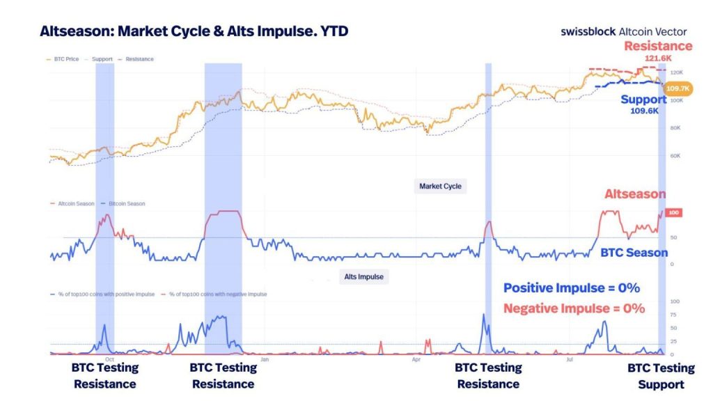 O Bitcoin agora consolida entre US$ 109.000 e US$ 121.000. Esse padrão lembra fases anteriores em que as altcoins superaram o BTC.