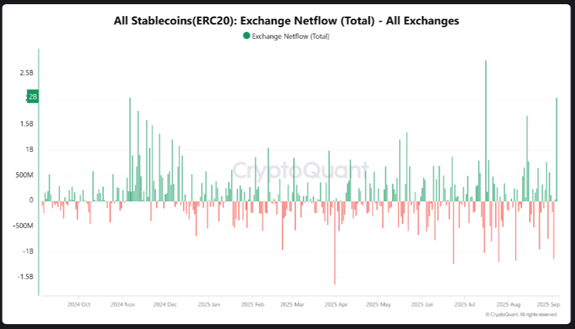 Os dados on-chain reforçam um cenário otimista. A CryptoQuant mostra que os fluxos de stablecoins para corretoras estão disparando, o que costuma anteceder movimentos fortes de compra.