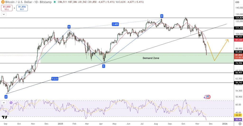 A criptomoeda recuou 15% nos últimos sete dias, quase 25% em novembro e 12% nas últimas 24 horas, negociando perto de US$ 81.915.