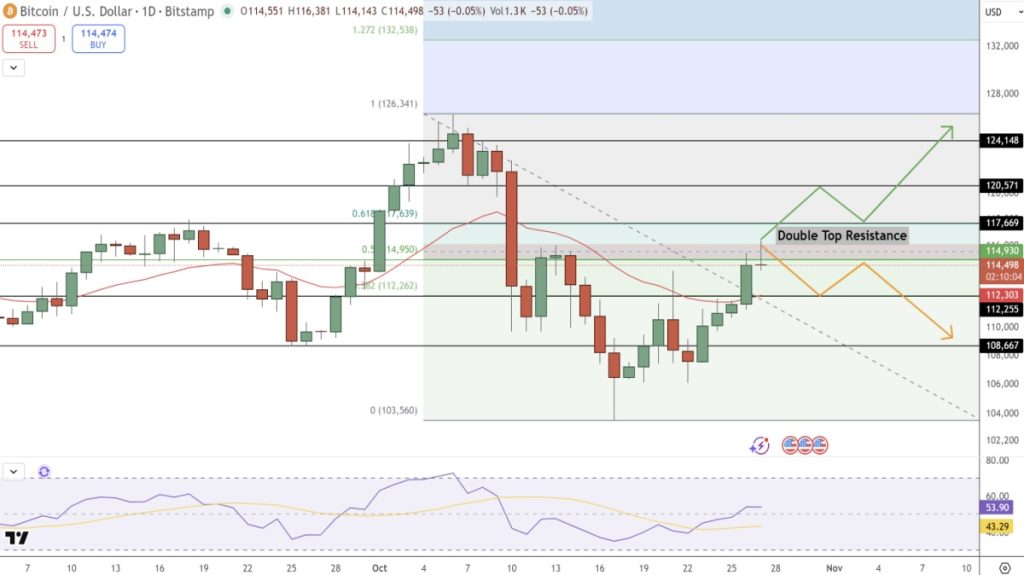 O Bitcoin (BTC/USD) é negociado em torno de US$ 114,57 mil hoje (28/10), consolidando-se após recuperar-se da zona de suporte de US$ 108,6 mil. O gráfico diário mostra um possível padrão de duplo topo perto de US$ 117,6 mil, alinhado ao nível de retração de Fibonacci de 61,8%, onde vendedores podem reaparecer.