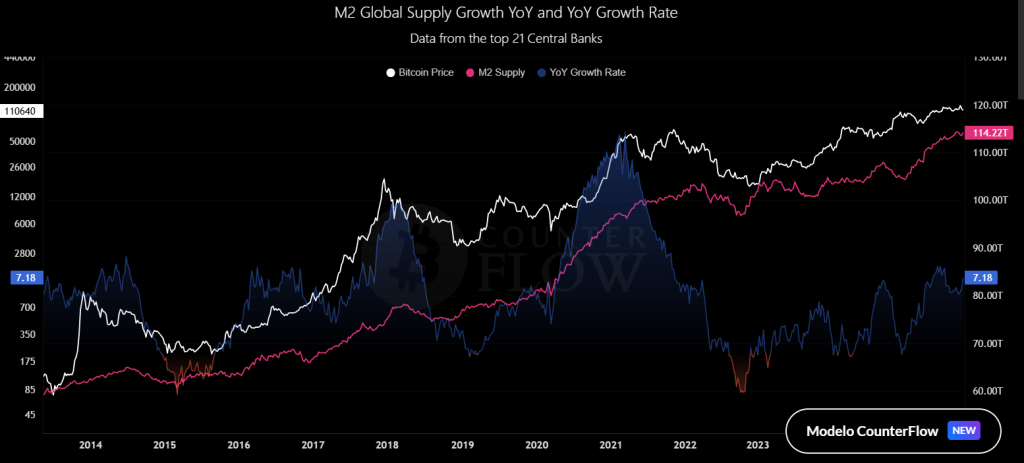 De acordo com a análise, o aumento do M2 explica parte relevante da variação histórica de preços do Bitcoin, reforçando sua correlação com a oferta de dinheiro e políticas monetárias globais.