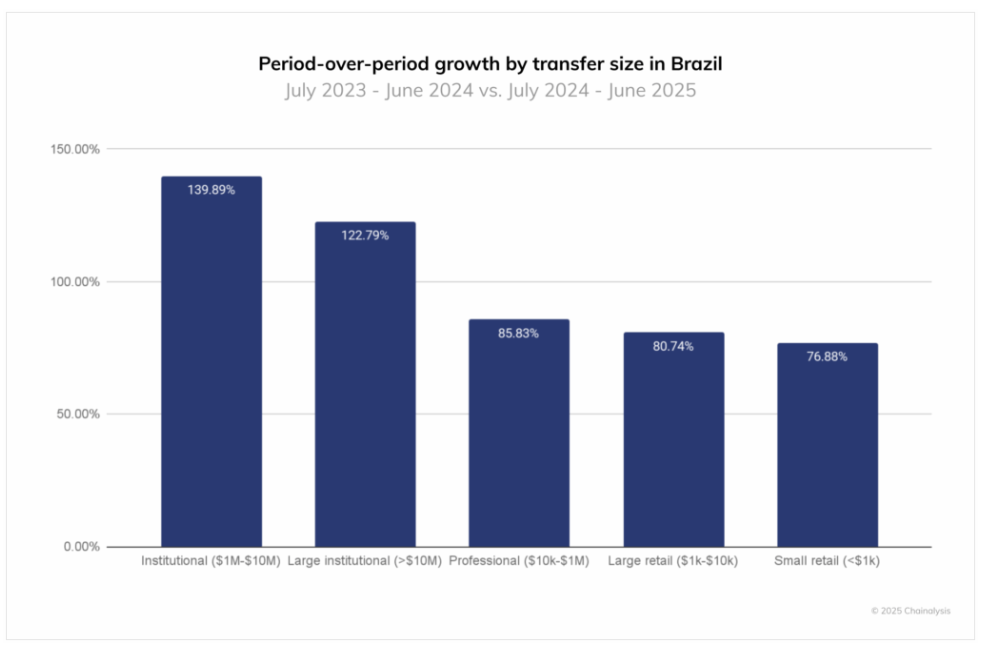 As transações cresceram em todas as faixas de valor, mostrando que tanto usuários comuns quanto fundos institucionais passaram a adotar criptomoedas como reserva de valor e meio de pagamento.