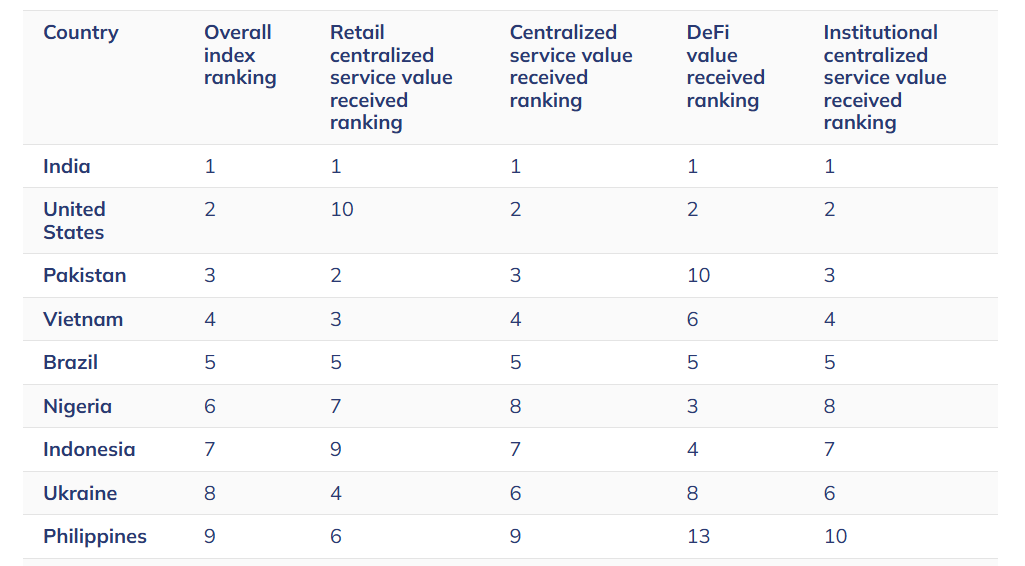 A liderança segue com a Índia, que manteve o primeiro lugar pelo uso maciço de criptoativos em transferências internacionais e pela popularidade de plataformas DeFi.