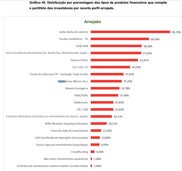 Segundo um estudo da Comissão de Valores Mobiliários (CVM), investidores com perfil arrojado alocam até 35,43% de suas carteiras em criptomoedas.