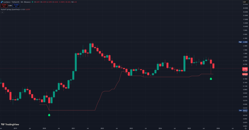 Ele destacou que a Cardano agora acaba de formar seu segundo Wyckoff Spring mensal — um forte sinal de acumulação.