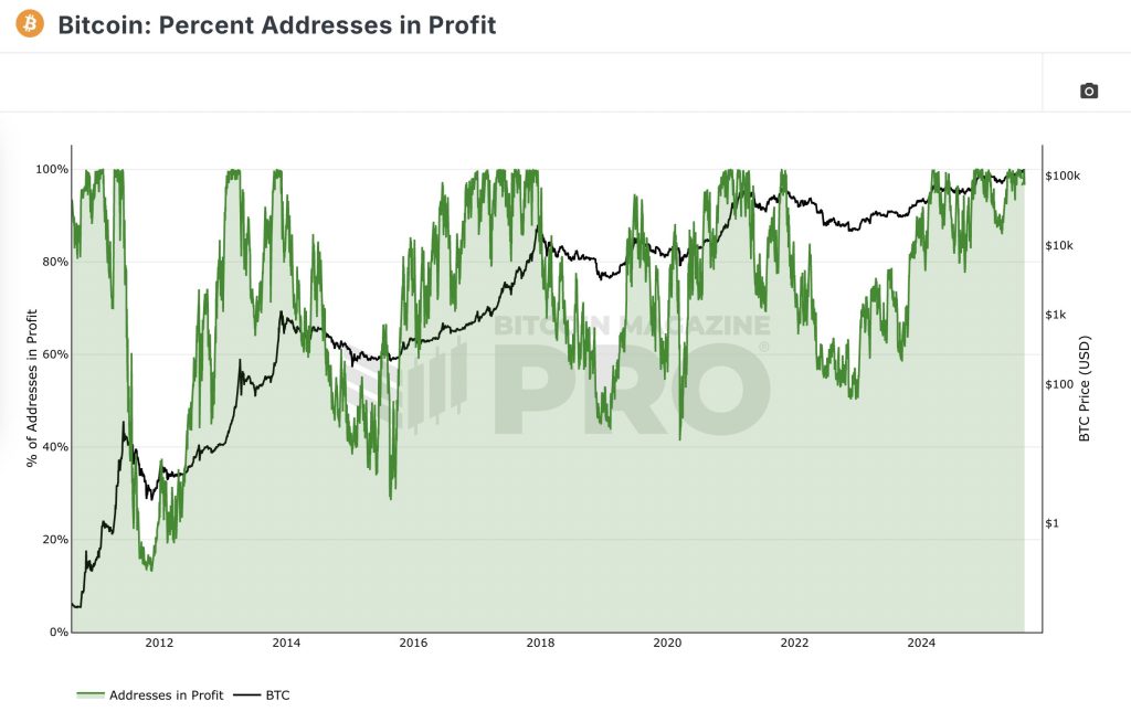O número máximo de endereços lucrando foi atingido recentemente, sinal que costuma anteceder movimentos de ajuste no preço.
