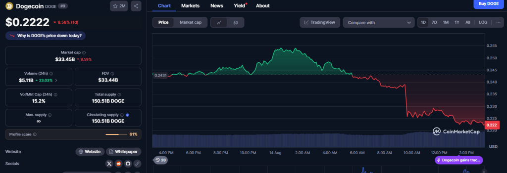 Apesar do otimismo, nas últimas 24 horas, o DOGE caiu 8%, contrariando a tendência positiva do restante do top 10 de criptomoedas por valor de mercado.