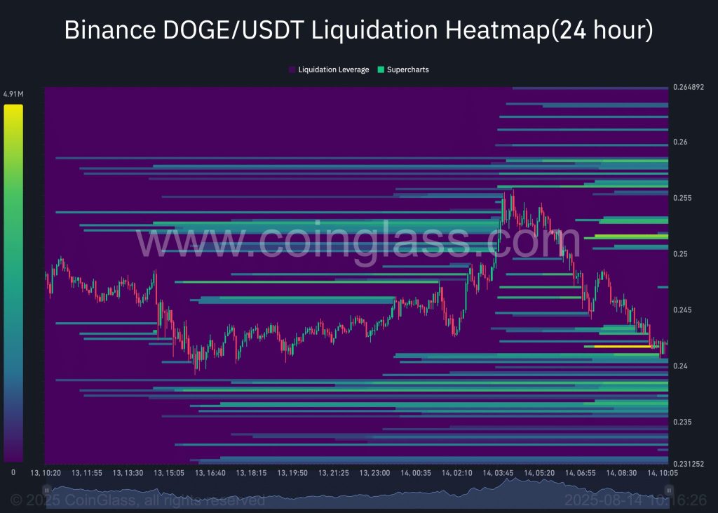 Além disso, o mapa de liquidez mostra que o DOGE está preso entre duas zonas-chave. Sendo a primeira, a superior, que pode gerar pressão vendedora se testada.