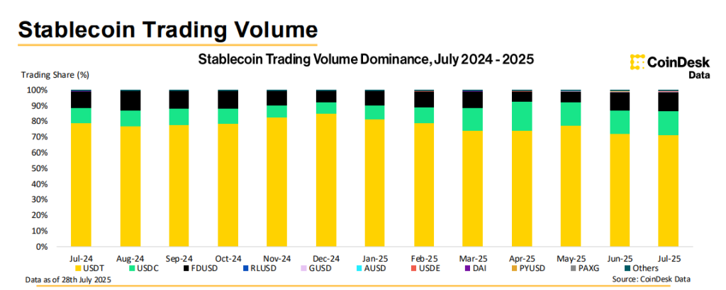 De acordo com o relatório, o volume de negociações das stablecoins em corretoras centralizadas atingiu US$ 1,68 trilhão no mês, acompanhando o rali cripto.