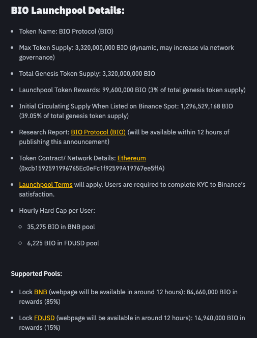 Além disso, a listagem oficial ocorrerá na Binance em 3 de janeiro de 2025, com pares de negociação como BIO/USDT, BIO/BNB, BIO/FDUSD e BIO/TRY.