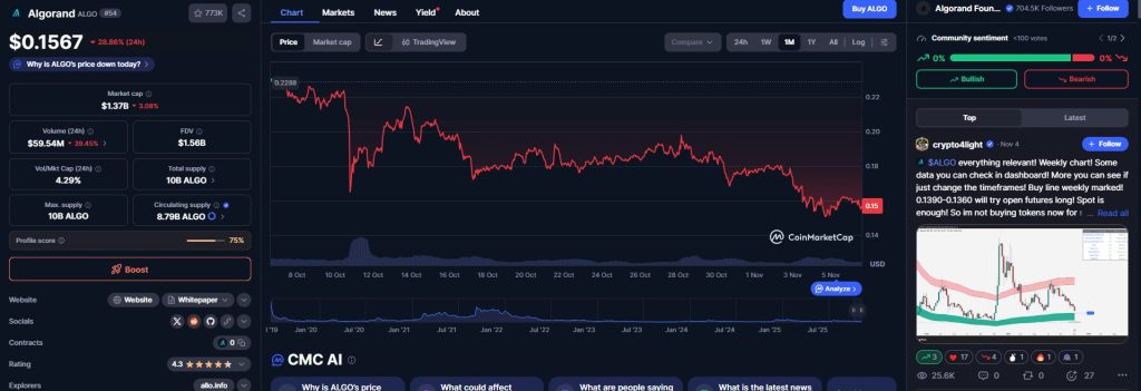 O mapa de liquidação da Binance mostra grandes concentrações entre US$ 0,155 e US$ 0,165, uma zona crítica que pode definir o próximo movimento da ALGO.
