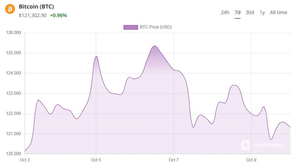 A moeda chegou a tocar a máxima intradiária de US$ 123.548, mas recuou até US$ 119.967 antes de se recuperar parcialmente para o patamar atual.