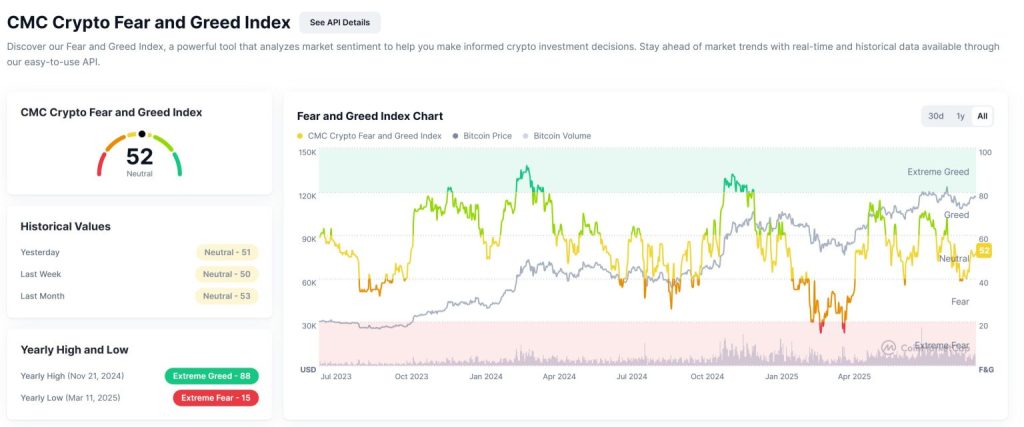 O Índice de Medo e Ganância segue neutro, em 52 pontos.