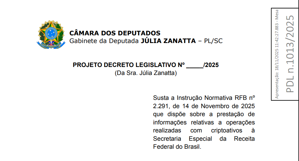 A parlamentar apresentou o PDL 1013/2025, que busca suspender imediatamente a Instrução Normativa publicada pela Receita, responsável por criar a chamada Declaração de Criptoativos (DeCripto).
