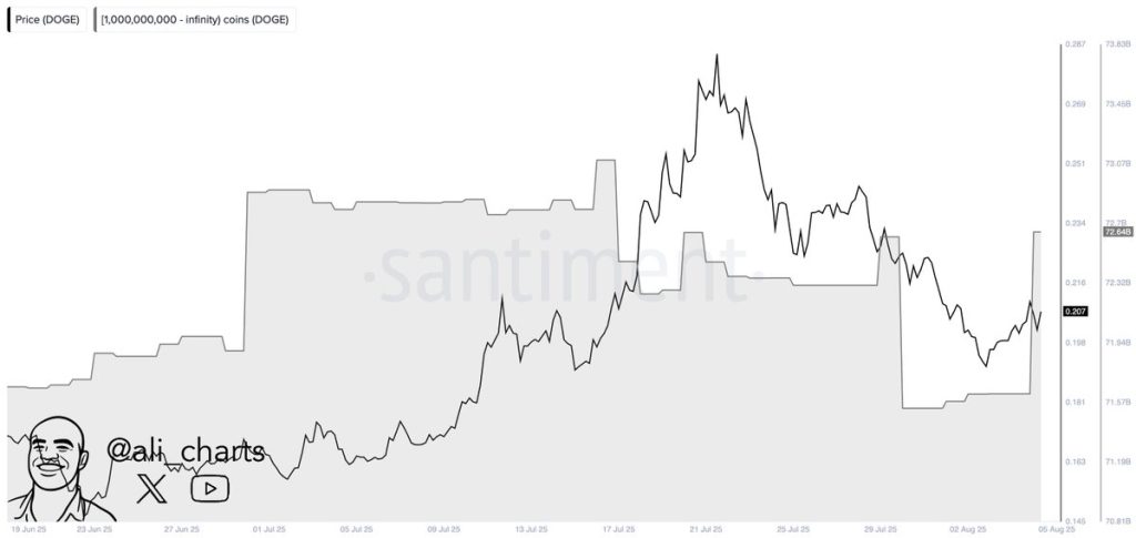 Dados on-chain revelam que grandes investidores compraram 1,08 bilhão de DOGE — equivalente a mais de US$ 200 milhões — nos últimos dois dias.