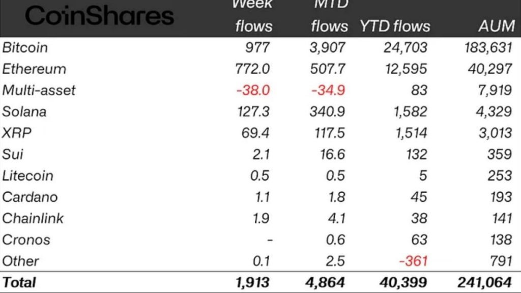 Sendo assim, os produtos de investimento em ativos digitais registraram quase US$ 2 bilhões em entradas entre 14 e 20 de setembro, segundo dados da CoinShares.