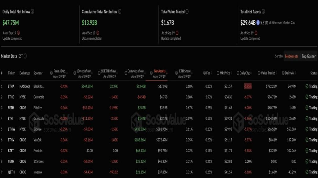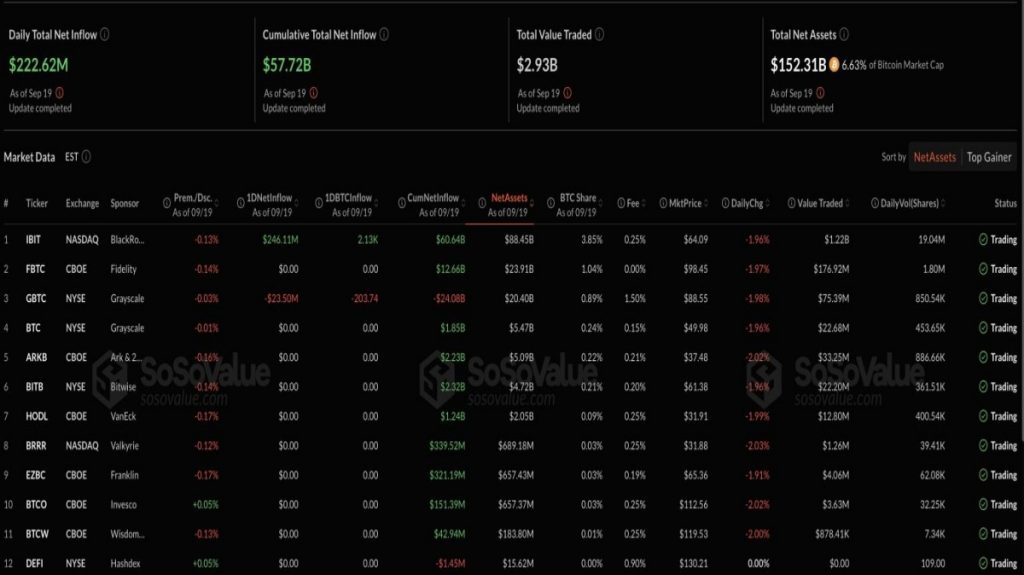 Mas, o interesse institucional seguiu forte via ETFs à vista. No dia 19 de setembro, os ETFs de BTC registraram US$ 222,6 milhões em entradas líquidas.