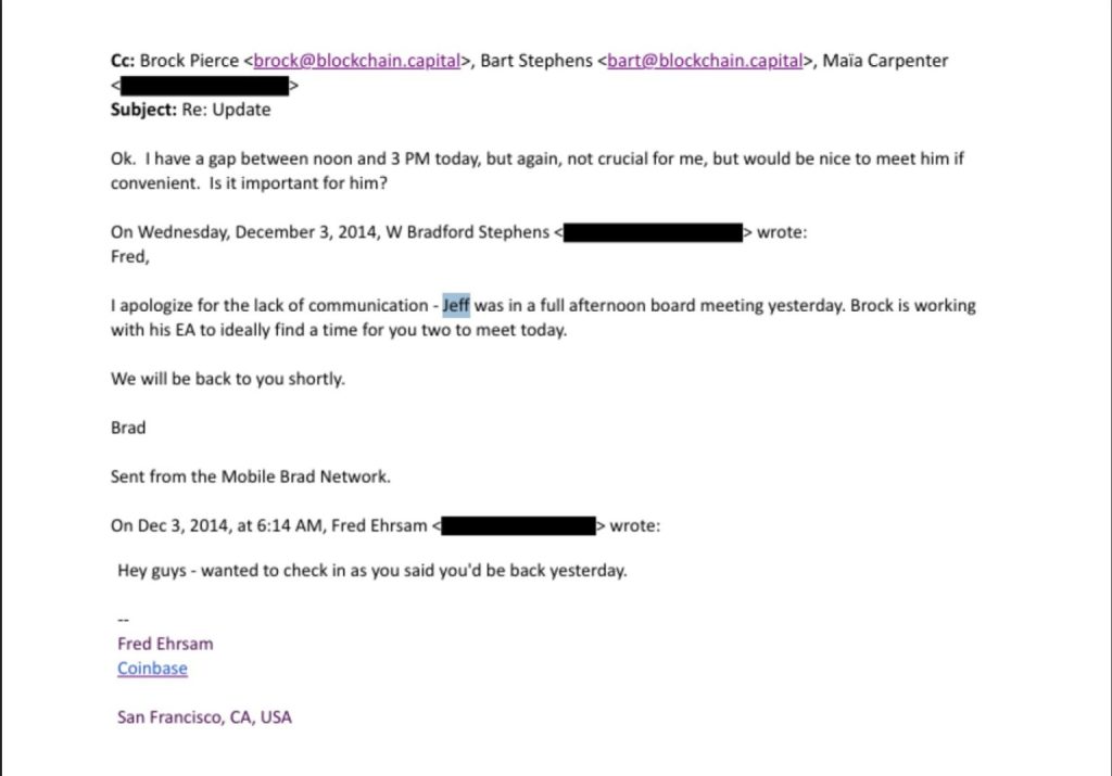 A compra supostamente garantiu a Epstein uma reunião cara a cara com o cofundador da Coinbase, Fred Ehrsam. Em uma captura de tela de e-mail vazada, há menção a Jeff junto com Ehrsam, indicando que Ehrsam poderia saber sobre seu envolvimento na Coinbase.