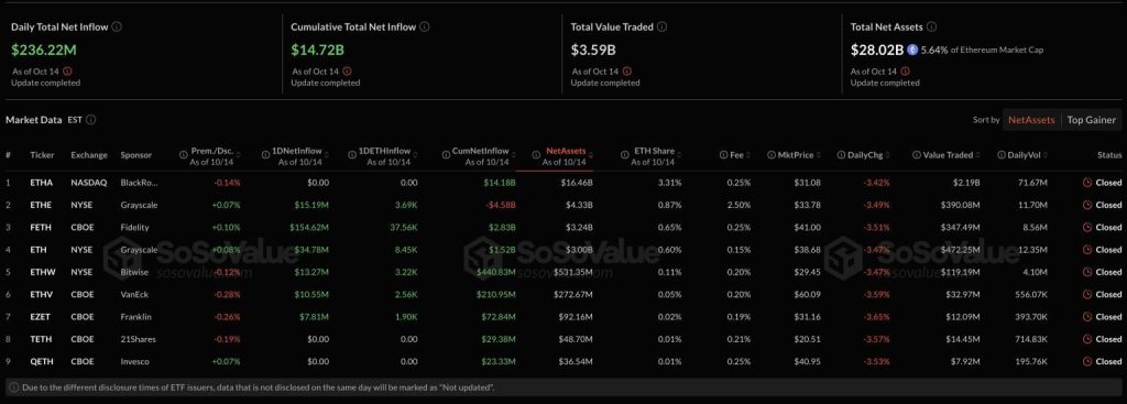 Após um dos fins de semana mais turbulentos em meses, os ETFs à vista de Bitcoin e Ethereum nos Estados Unidos registraram um forte retorno no dia 14 de outubro.