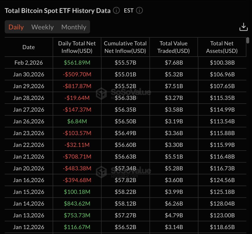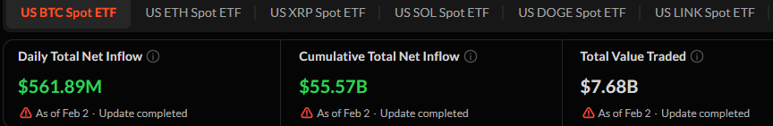 Os fundos negociados em bolsa (ETFs) de Bitcoin à vista nos EUA experimentaram uma reviravolta nos fluxos de investidores. Em 2 de fevereiro, houve quase US$ 562 milhões em fluxos líquidos diários atraídos após semanas de saídas líquidas acentuadas.