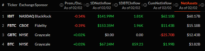 O FBTC da Fidelity liderou o dia em entradas, atraindo US$ 153,35 milhões, ou cerca de 1.960 BTC. As entradas acumuladas do fundo subiram para US$ 11,43 bilhões, com ativos líquidos totais de US$ 15,18 bilhões.