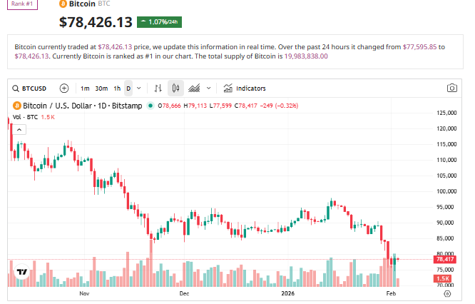 A recuperação ocorreu quando os preços do Bitcoin se estabilizaram modestamente após semanas de quedas. O Bitcoin foi negociado em torno de US$ 78.900, um aumento de aproximadamente 2,5% no dia, enquanto o Ethereum subiu cerca de 3%, para US$ 2.314.