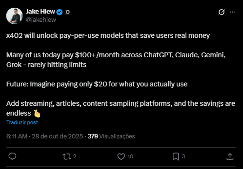 Os agentes também poderão utilizar o protocolo de pagamento x402, desenvolvido pela Coinbase, que permite que sistemas de IA façam e recebam pagamentos automaticamente.