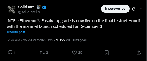 O cronograma segue o plano traçado em setembro, quando a equipe técnica priorizou o Fusaka e suspendeu discussões sobre futuras atualizações, como Glamsterdam, prevista apenas para 2026.