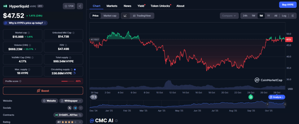 Do ponto de vista técnico, a Hyperliquid opera em uma zona de resistência entre US$ 47 e US$ 49, que historicamente provocou recuos.