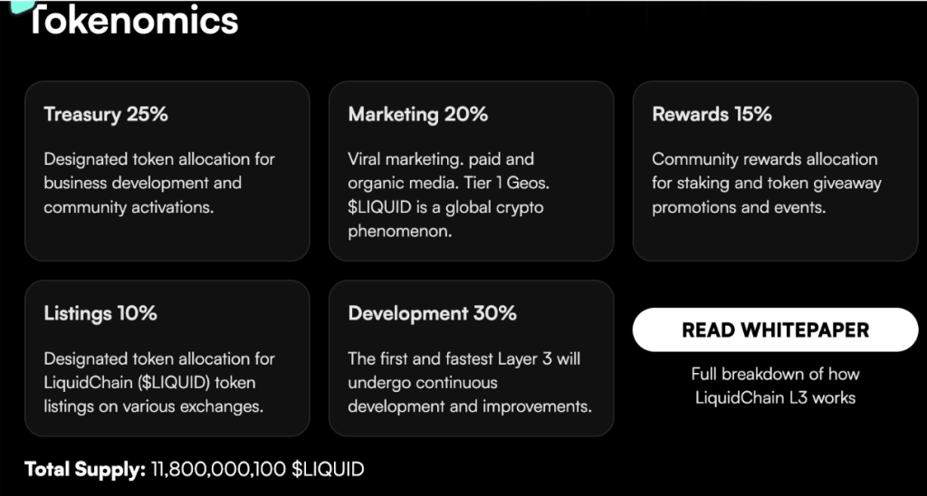 A distribuição para a comunidade também é feita com $LIQUID, em programas de staking, campanhas promocionais e eventos.