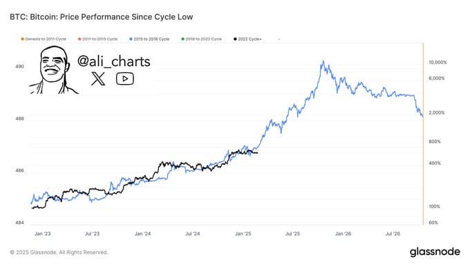 Martinez comparou o atual ciclo do Bitcoin com os anteriores e apontou dois cenários possíveis: