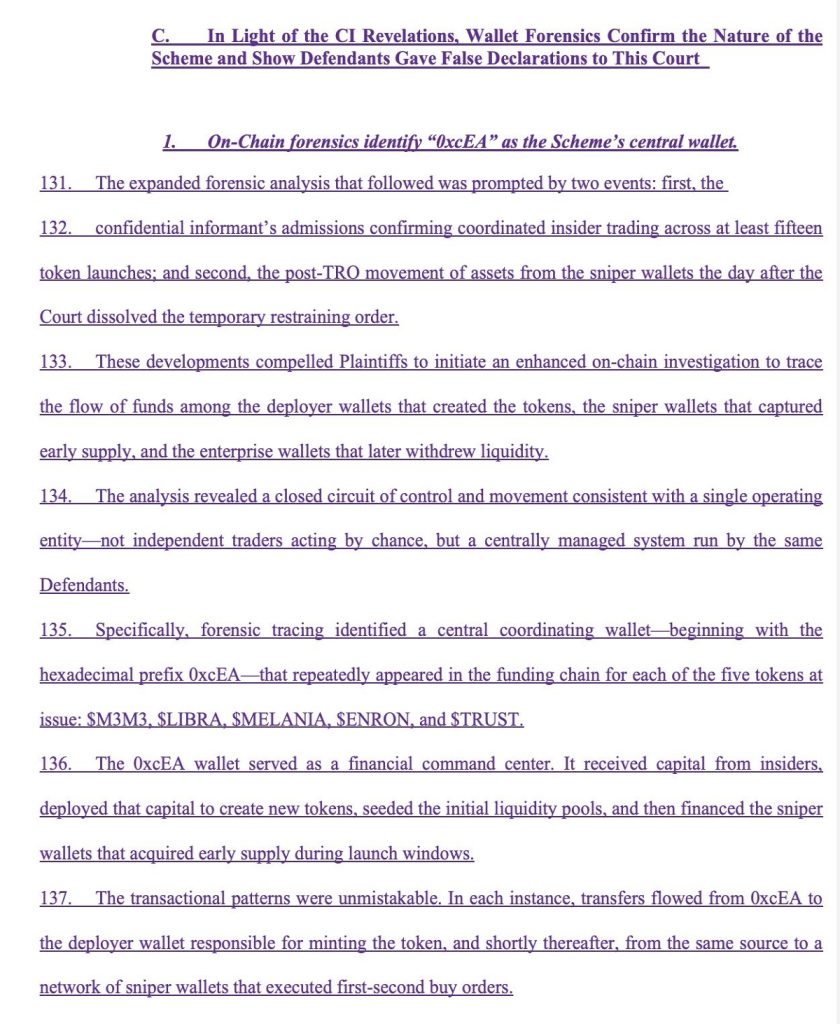 Os proponentes da ação, Omar Hurlock, Anuj Mehta e John Winslow afirmam que os réus manipularam configurações técnicas, como listas brancas e alternância de congelamento e descongelamento, para obter a maior parte do fornecimento dos tokens a custo mínimo.