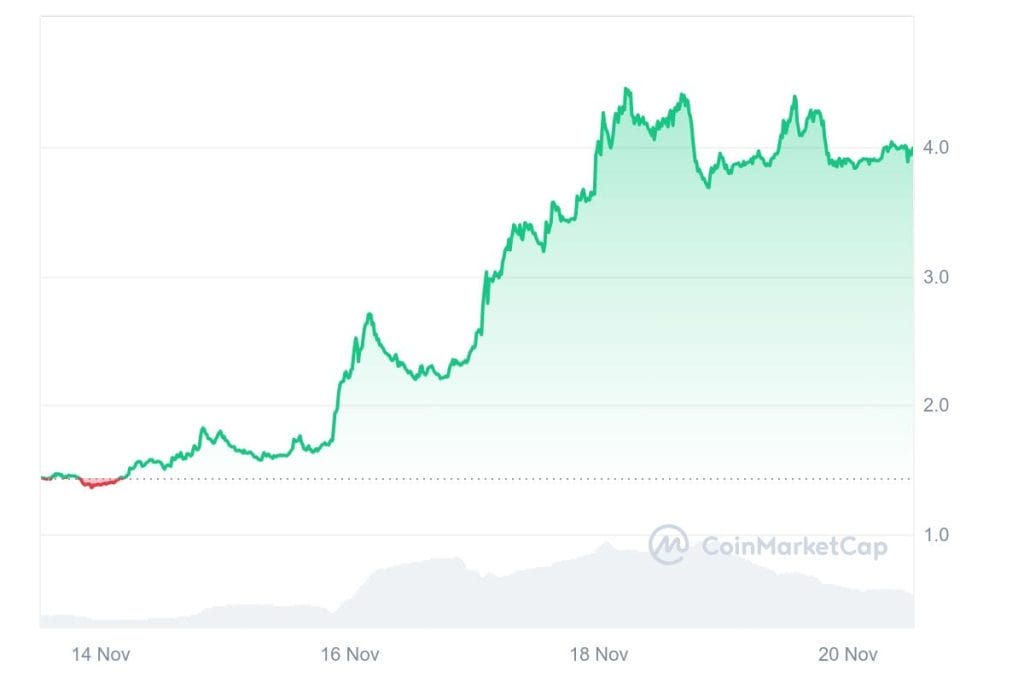 O projeto teve um grande impulso, com a capitalização de mercado subindo para US$ 3,59 bilhões. Ademais, o preço do token subiu 177,29% na semana passada.