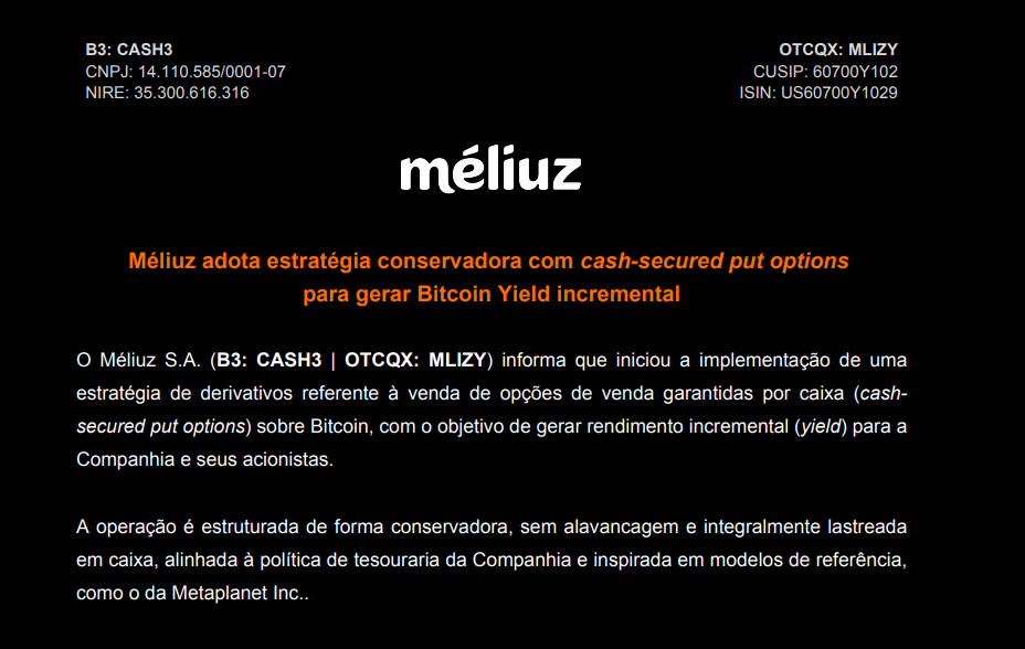 No fato relevante, a Méliuz explicou que está vendendo opções de venda de Bitcoin com preços de exercício previamente definidos.