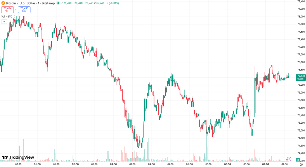 No momento da redação deste artigo, na manhã de segunda-feira (02/02), o BTC estava sendo negociado a US$ 76.472. Até o momento, o dia tem sido relativamente calmo para a moeda. Ela diminuiu lentamente da alta intradiária de US$ 79.049 para a baixa do dia de US$ 74.591.