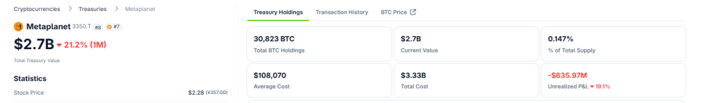 Mas, com o Bitcoin abaixo desse valor, a Metaplanet registra perda não realizada de US$ 635,97 milhões. Ou seja, –19,1%, segundo a atualização mais recente do balanço de BTC.