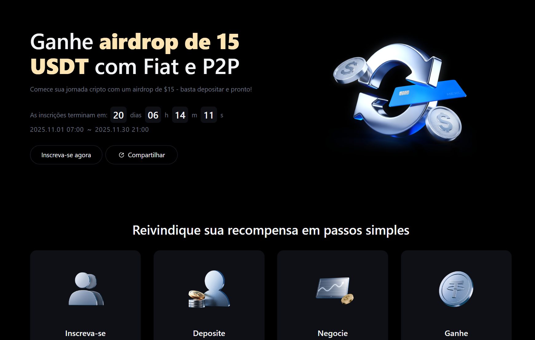 Quem fizer o primeiro depósito via fiat ou P2P de, no mínimo, 100 USDT, e realizar uma operação de futuros de 50 USDT ou mais, recebe um bônus de 15 USDT em airdrop — pago em recompensa real, não em cupons.