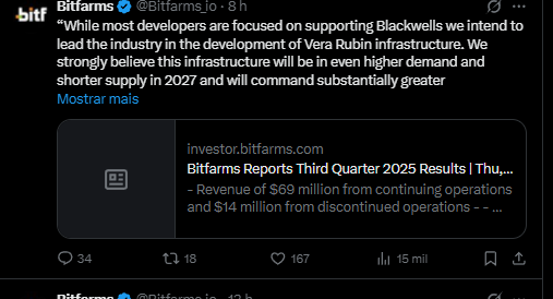 Enquanto isso, o mercado reagiu de forma dura à notícia. As ações da Bitfarms despencaram cerca de 18%, fechando a US$ 3,62 na quinta-feira e acumulando queda superior a 50% no mês.