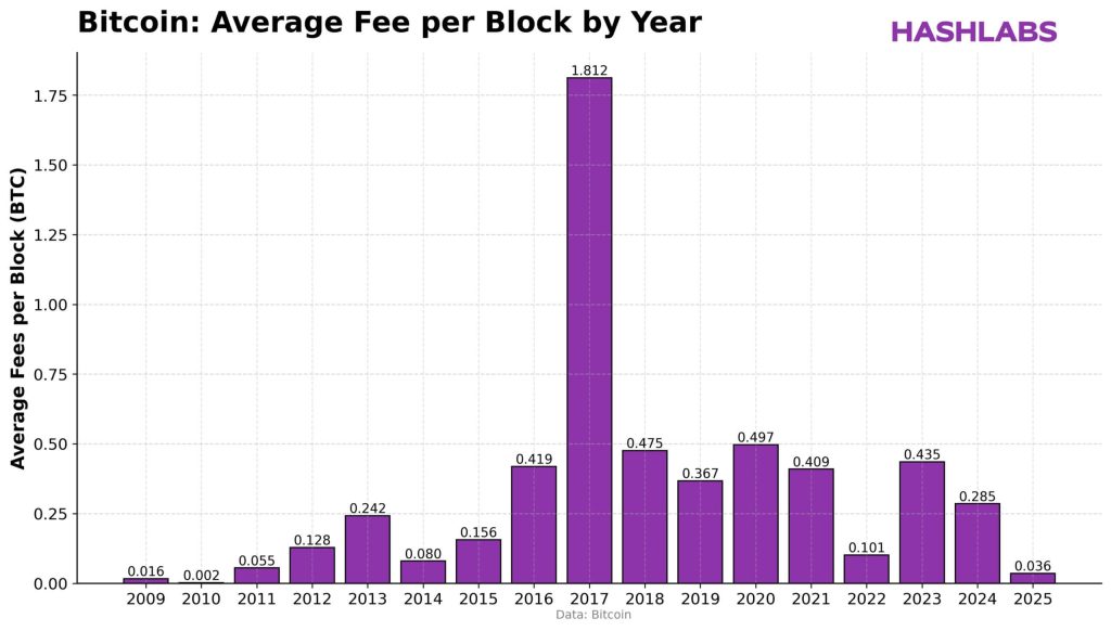 As taxas de transação, que poderiam compensar essa perda, também despencaram. Em 2025, a média por bloco é de 0,036 BTC, a mais baixa desde 2010.
