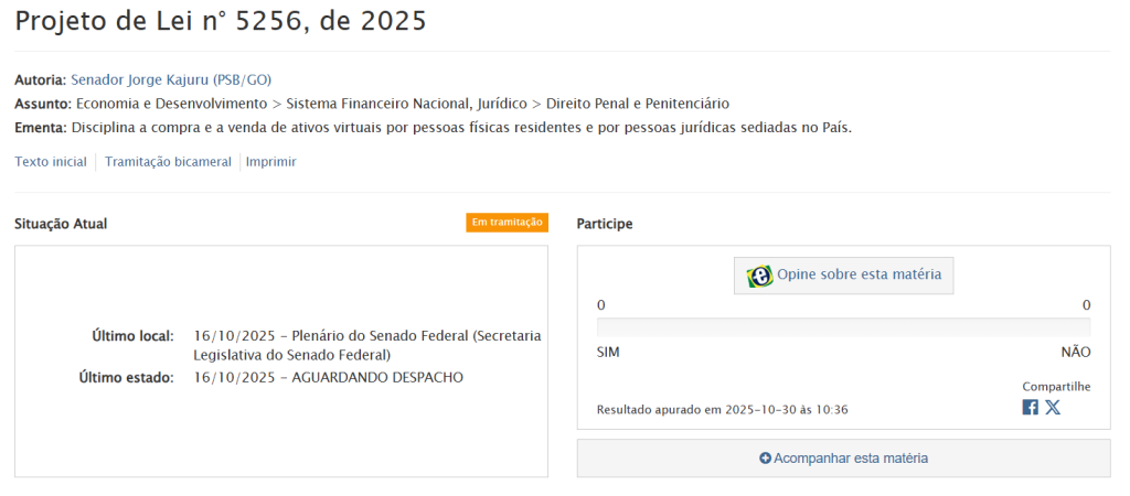 O projeto de lei ainda não tem relator designado e está em fase inicial de tramitação no Senado. Após a análise nas comissões, deverá seguir para votação no Congresso Nacional e, em seguida, para sanção presidencial.