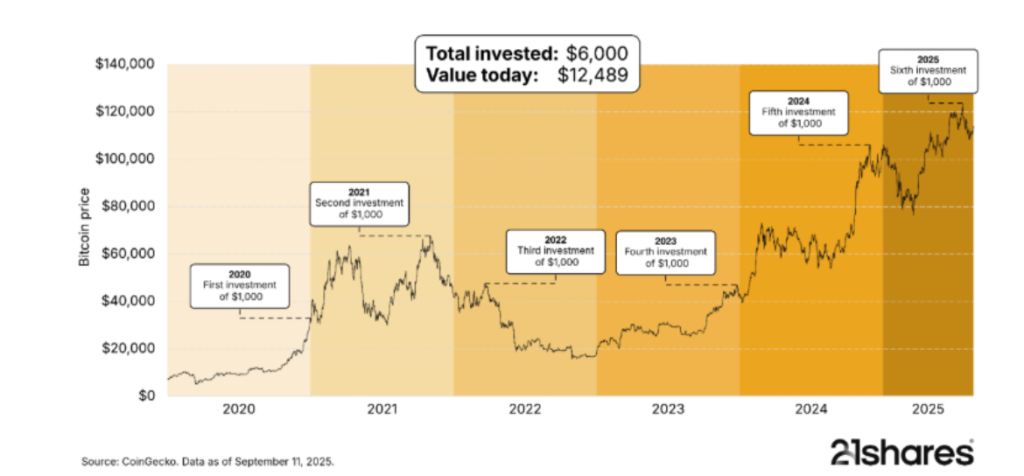 De acordo com o estudo, se um investidor tivesse aplicado US$ 1.000 em Bitcoin nas máximas anuais entre 2020 e 2025, teria transformado US$ 6.000 em mais de US$ 12.489 até setembro deste ano.