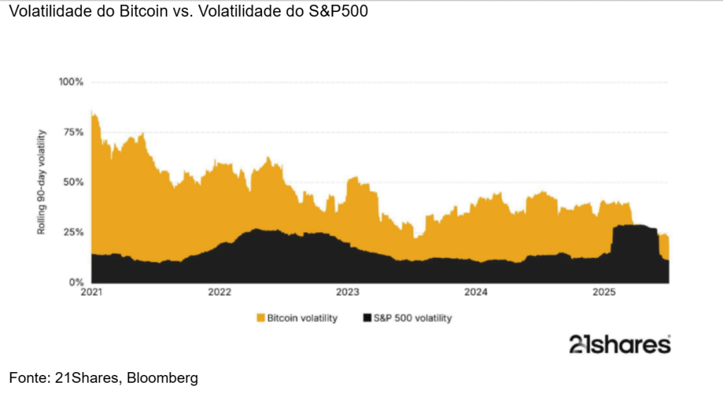 O estudo também aponta que, enquanto o Bitcoin ainda carrega a fama de ativo volátil, sua maturidade crescente tem reduzido o risco de quedas acentuadas.