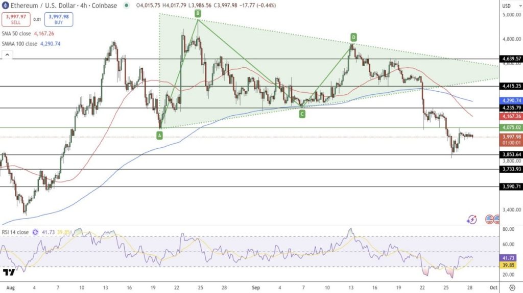Apesar da pressão institucional, o Ethereum resistiu. No domingo (28/09) voltou acima de US$ 4 mil. Compradores ainda enxergam valor nesses níveis.