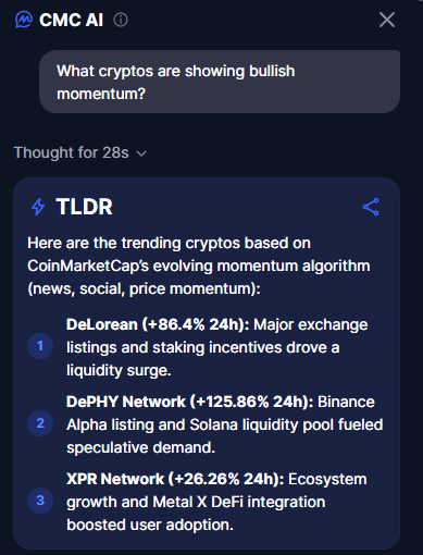 Quais criptomoedas estão em tendência de alta? IA do CoinMarketCap destaca 3 projetos
