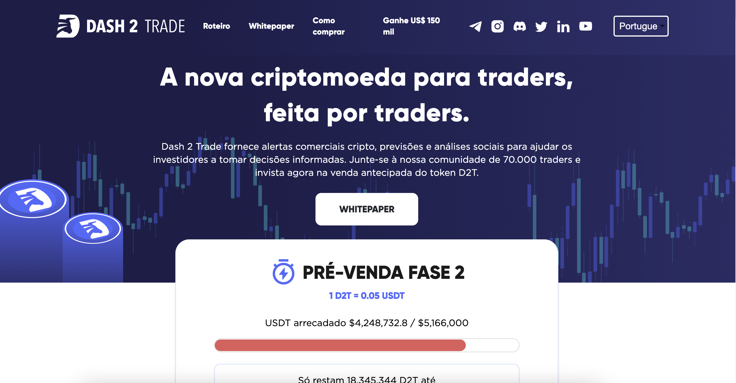 Haverá, também, recursos de investimento social, competições de negociação com prêmios, ferramentas de construção de estratégias, instalações de backtesting e muito mais. A campanha de pré-venda do Dash 2 Trade está em andamento e, atualmente, está no estágio dois – o que significa que o preço do token D2T é de apenas US$ 0,05. À medida que cada estágio se esgota, o preço do token aumenta.
