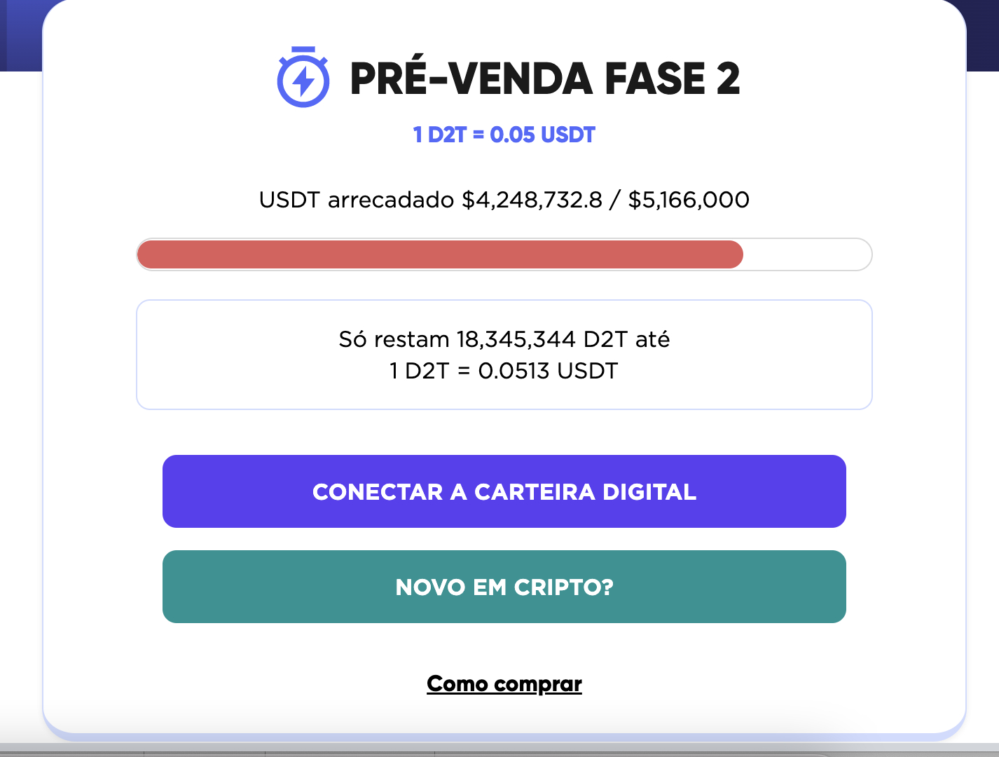 Início da pré-venda19 de outubroMétodos de compraETH, USDT, TransakRedeEthereumInvestimento mín.1,000 D2TInvestimento máx.N/A