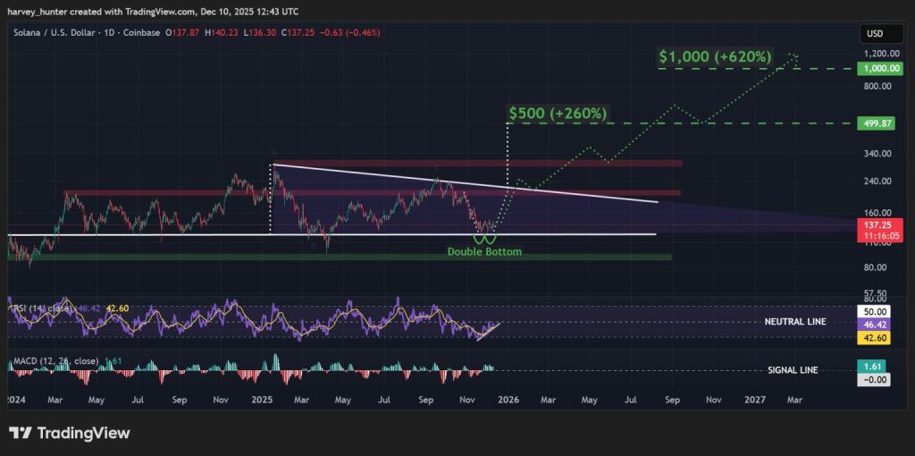 Atualmente, o valor da Solana agora gira em torno de US$ 145, região que marca a linha de pescoço de um padrão de fundo duplo.
