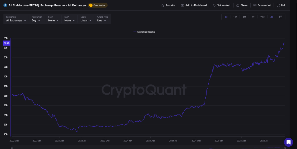 Dados da Binance e da CryptoQuant mostram que as reservas de stablecoins em exchanges já passam de US$ 65 bilhões, um crescimento de 74% desde 2022.