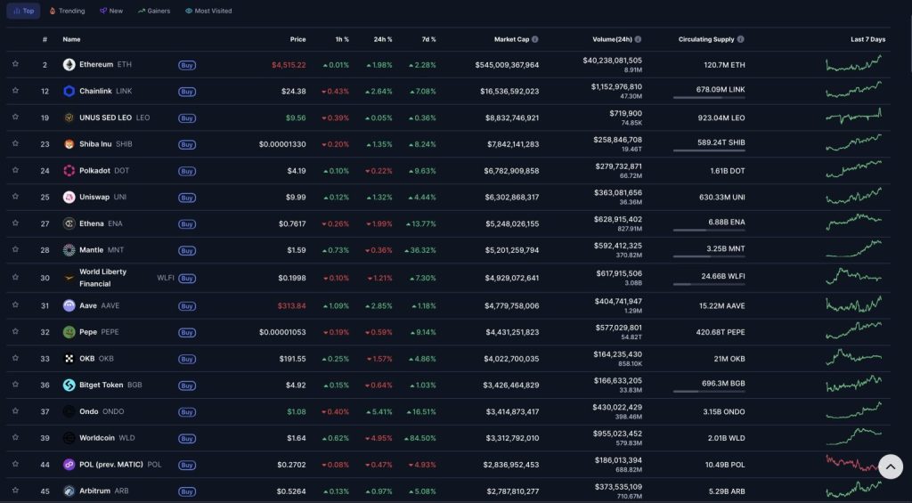Os ganhos ficaram com Mantle (MNT), Ondo (ONDO) e Worldcoin (WRD). O quadro reflete crescimento seletivo, sem o Ethereum ditando ritmo.