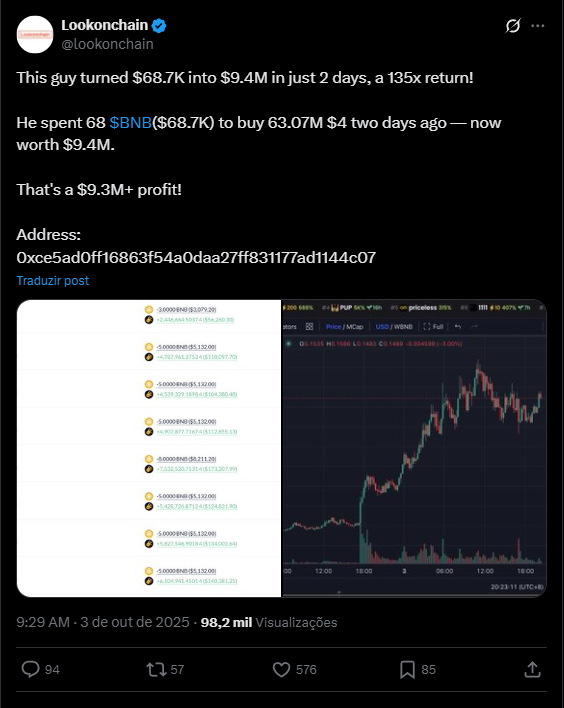 Trader transforma US$ 68 mil em US$ 10 milhões com memecoin na BNB Chain